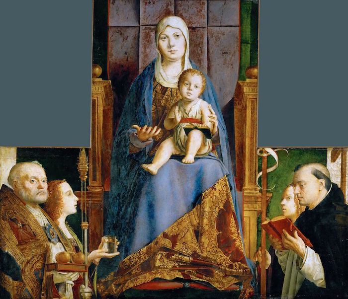 Antonello assembles the painting’s figures symmetrically around the elevated throne of the Madonna, all placed within a large-scale architectural setting.