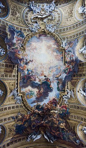 Baciccia's frescoes, a tour-de-force in illusionistic painting, depict the church's roof as opening up above the viewer, enabling the panorama to be viewed in true perspective di sotto in su.