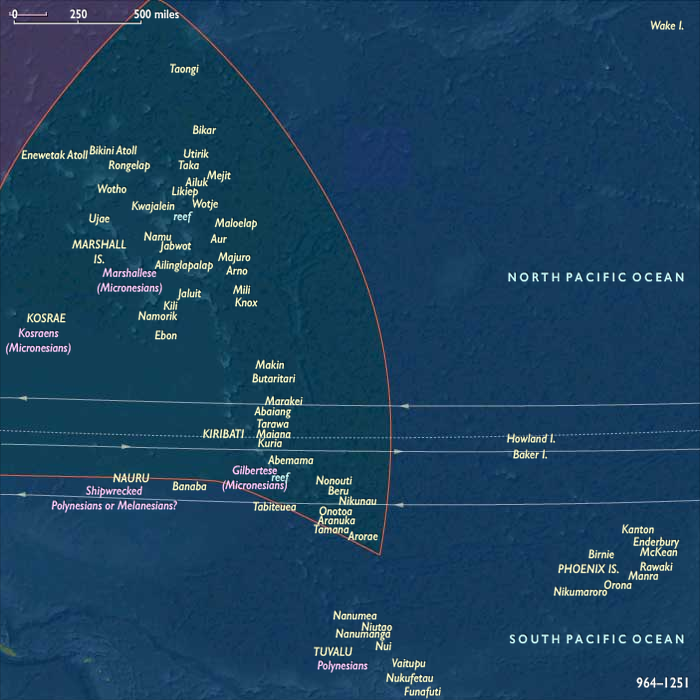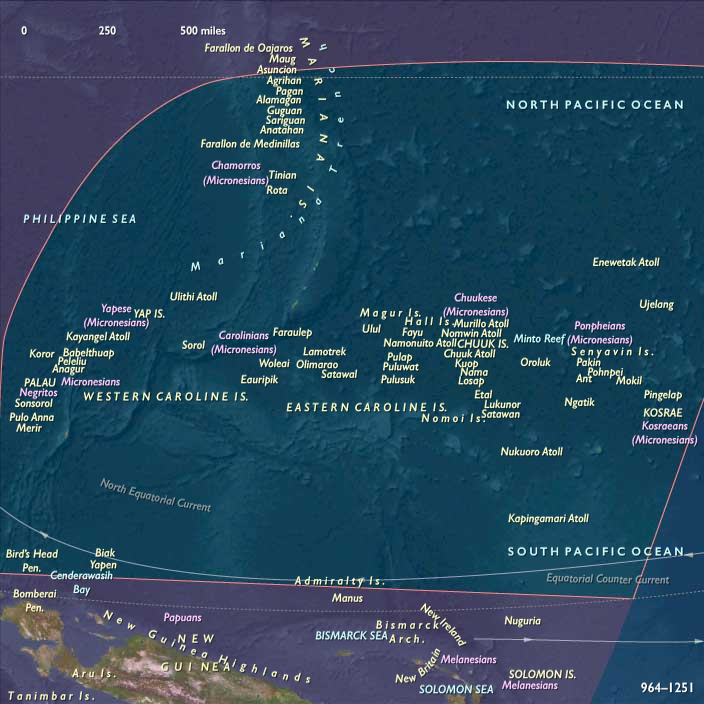 Micronesia in the Lower High Medieval Age stretched across the western and central Pacific — from the Mariana Islands and Yap–Chuuk–Palau complex in the west to the Marshall Islands, Kiribati, Kosrae, and Nauru in the east.