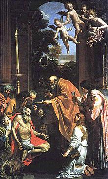 Concurrently he had painted his first, and most celebrated, altarpiece, The Last Communion of St. Jerome, for the church of San Girolamo della Carità (signed and dated, 1614).
