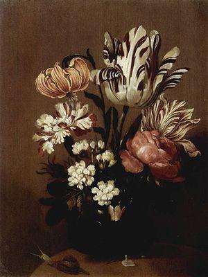 Hans Gillisz Bollongier, a specialist in bouquets of blooms, paints during a period of great productivity for Haarlem painters, during the decades after Karel van Mander published his Schilderboeck here.