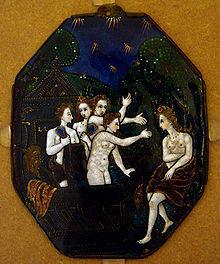 For both these monarchs, he has has executed many portraits in enamel—among them quite a number of plaques depicting Diane de Poitiers in various characters, plates, vases, ewers, and cups, besides decorative works for the royal palaces, for, though he is best known as an enameler distinguished for rich color, and for graceful designs in grisaille on black or bright blue backgrounds, he also enjoys a great reputation as an oil-painter.