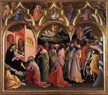 Lorenzo Monaco employs delicately patterned forms that are both decorative and naturalistic in the “Monte Oliveto Altarpiece,” executed in 1410, and The Coronation of the Virgin, characterized by a great number of saints and brilliant colors and painted in 1414.