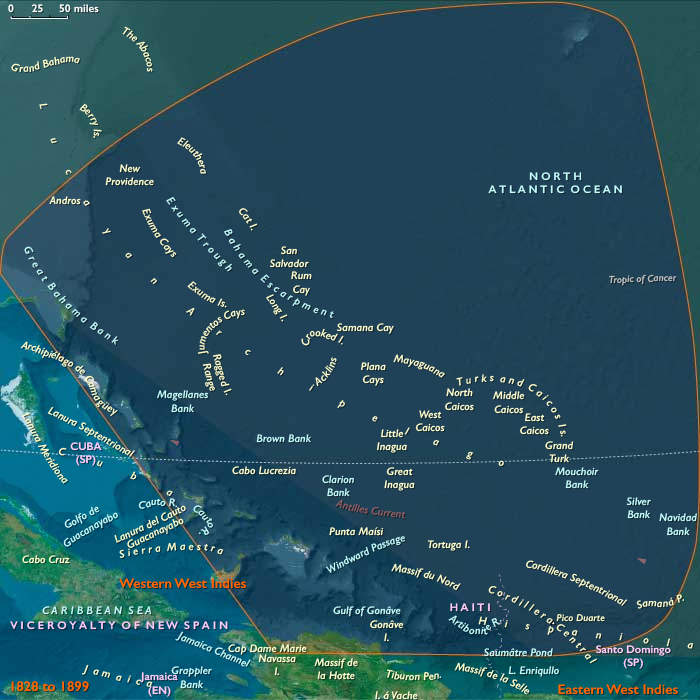 The subregion of Northern West Indies includes Bermuda, the Turks and Caicos, northern Hispaniola, and the Outer Bahamas (Grand Bahama, Abaco, Eleuthera, Cat Island, San Salvador, Long Island, Crooked Island, Mayaguana, Little Inagua, and eastern Great Inagua). The Inner Bahamas belong to the Western West Indies. Anchors included the Bahama Banks, Bermuda’s naval dockyards, the Caicos salt pans, and the northern valleys of Hispaniola.