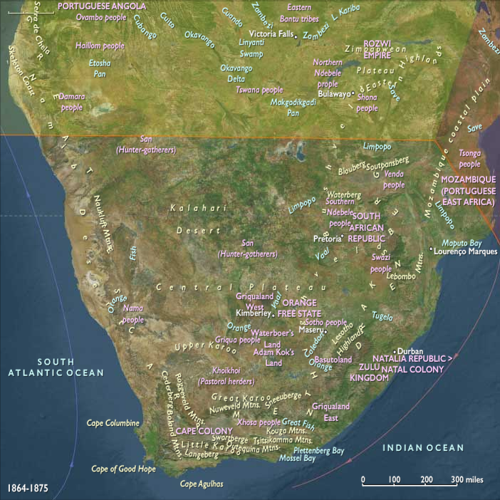 There are now two British colonies on the coast (Cape Colony and Natal) instead of one, and two Voortrekker republics on the southern and the northern Highveld (the Orange Free State and the South African Republic).