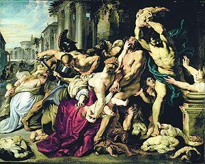 Peter Paul Rubens’ first version of the Massacre of the Innocents, painted by the artist around 1611–12, is widely regarded as a demonstration of the artist's learnings from his time spent in Italy between 1600 and 1608, where he had observed first-hand the works of Italian Baroque painters like Caravaggio.