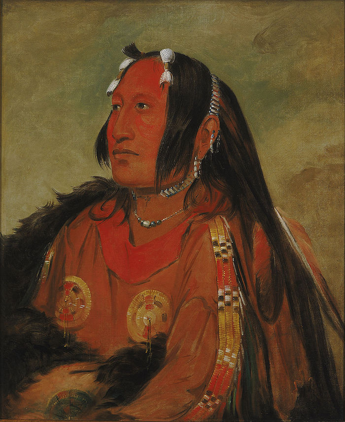 George Catlin: Wi-jún-jon, Pigeon's Egg Head (The Light), a Distinguished Young Warrior (1831), oil on canvas 73.6 cm (29 ″) x 60.9 cm (24 ″); Smithsonian American Art Museum. Catlin painted this subject at three different points in his life: young (this painting), then before and after the subject visited Washington, D.C. The warrior was ostracized by his tribe after he returned from Washington.