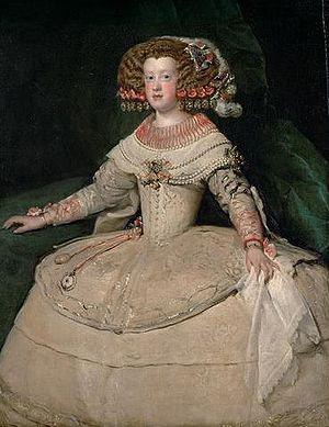 Diego Velázquez: The infanta Maria Theresa of Spain or The infanta Maria Theresa aged 14 (1652-3) Oil on canvas, 127 x 98,5 cm, Kunsthistorisches Museum, Vienna. Here, the princess wears her hair in a popular style at the Spanish royal court, and also wears extremely wide panniers, also popular in Spain.