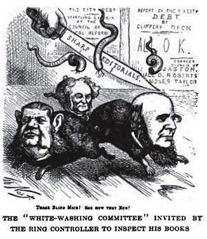 They had been able to force an examination of the city's books, but the blue-ribbon commission of six businessmen appointed by Mayor A. Oakey Hall, a Tammany man, which includes John Jacob Astor III, banker Moses Taylor and others who benefit from Tammany's actions, had found that the books had been "faithfully kept", letting the air out of the effort to dethrone Tweed.