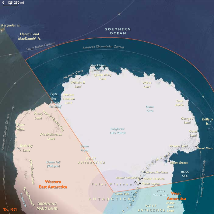 Between them lies the Transantarctic Mountains, dividing basins that feed the Ross and Ronne–Filchner Ice Shelves.