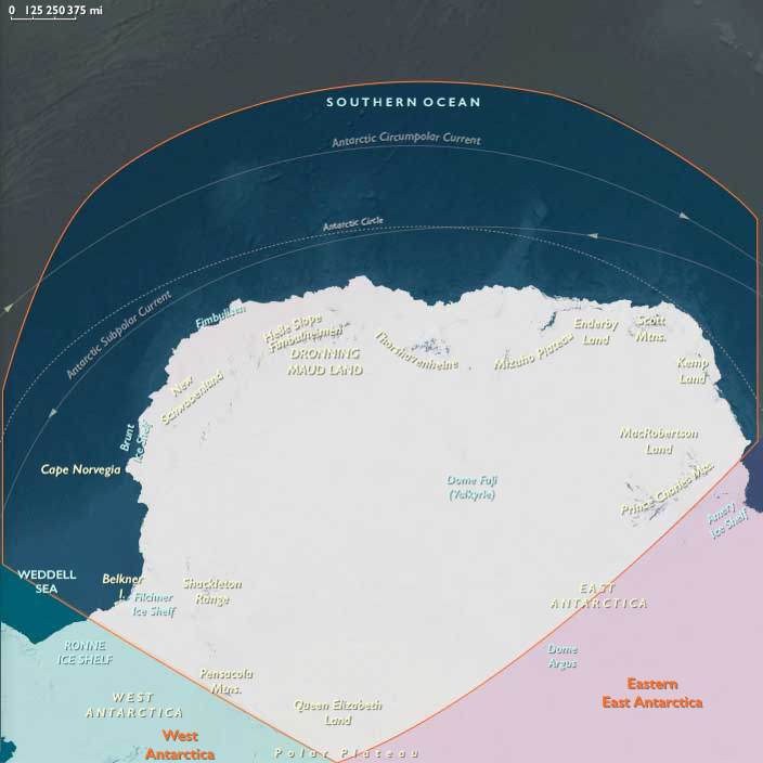 East Antarctica, the vast polar plateau rising more than 3 km above sea level, capped by the thickest ice on Earth.