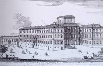 At the rear, a long wing protects the giardino segreto ("secret garden"), from the piazza below, above which it rises from a rusticated basement that is slightly battered like a military bastion.