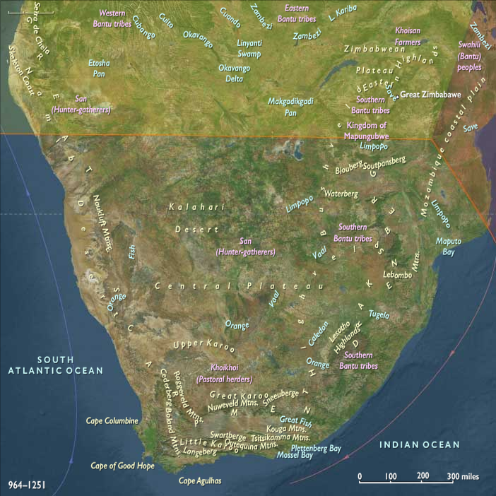Bantu-speaking peoples begin to move into the region of present South Africa from the northeast in about 1000, gradually displacing the San and Khoikhoi hunters and gatherers.