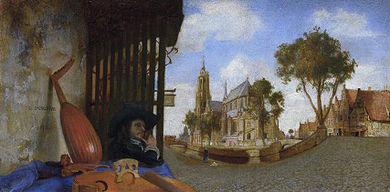 Fabritius is interested in complex spatial effects, as can be seen in the exaggerated perspective of A View in Delft, with a Musical Instrument Seller's Stall (1652).