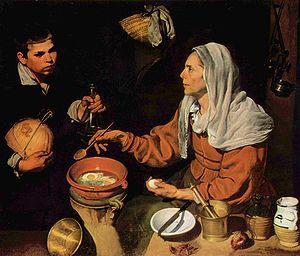 Velázquez frequently uses working-class characters in such early works, using his family as models in many cases: the old woman here also appears in his Christ in the House of Martha and Mary, painted in 1618).