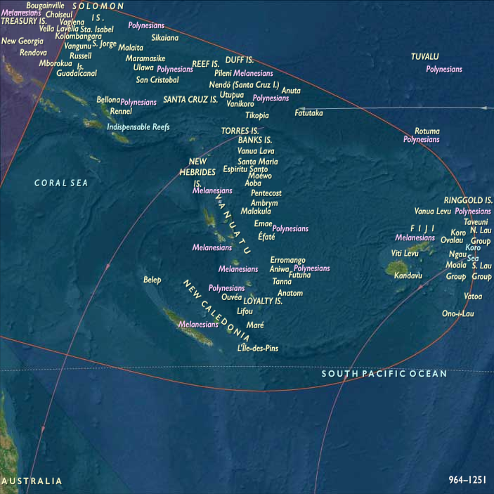 Melanesia in the Lower High Medieval Age stretched from the Bismarck Archipelago and New Guinea Highlands eastward through Vanuatu, Fiji, New Caledonia, and the Solomon Islands.