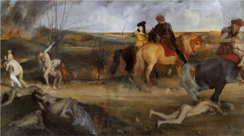 The painting is arguably his most curious composition, in which nine female nudes are shot, or are being shot at, by fifteenth-century mounted archers who ride stirrupless, with the horses’ harnesses barely sketched in.