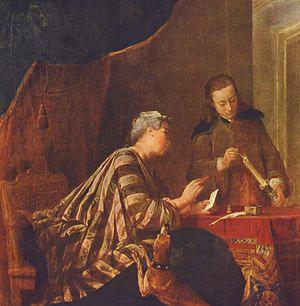 Jean-Baptiste-Siméon Chardin had ceded his position in the Académie de Saint-Luc a year after his admission to the Académie Royale de Peinture et de Sculpture, and is now making a modest living by "produc[ing] paintings in the various genres at whatever price his customers chose to pay him", and by such work as the restoration of the frescoes at the Galerie François I at Fontainebleau in 1731. (Rosenberg, Pierre, and Florence Bruyant (2000), Chardin. p. 20. London: Royal Academy of Arts).