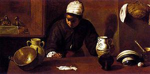 It shows a mulatto kitchen maid, with the supper at Emmaus in the left background.