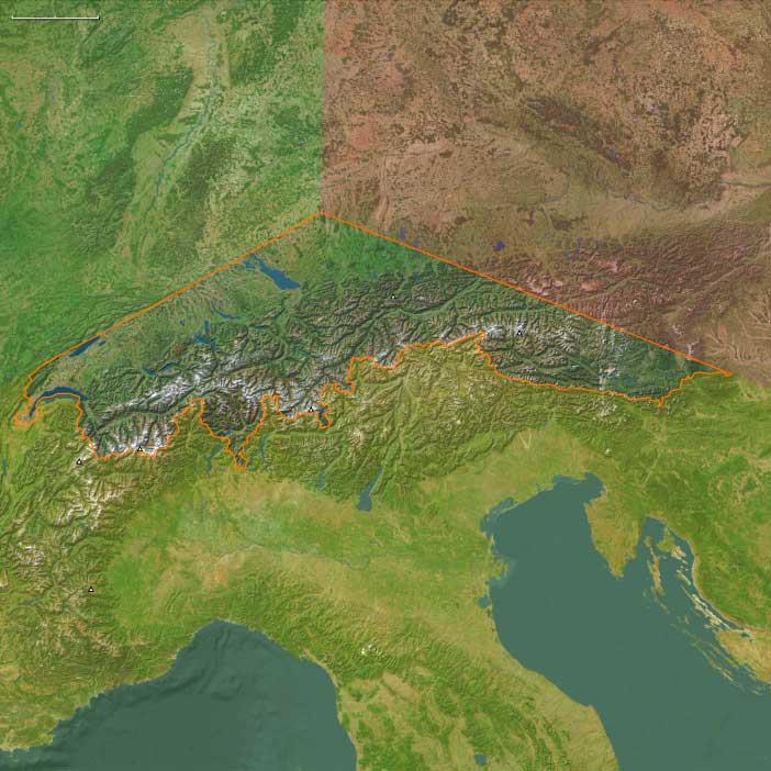 Geographic scope (corrected): Liechtenstein; most of Switzerland (excluding the far northwest); the extreme southern parts of Germany (southeastern Baden-Württemberg, southwestern Bavaria); and southwestern Austria—Vorarlberg, Tyrol, and Carinthia.