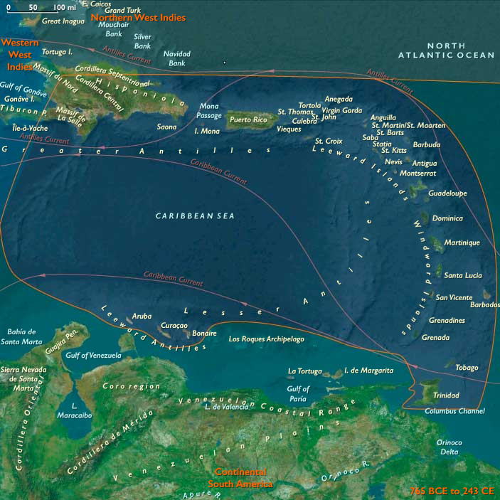 The agriculturist Arawaks, most likely of Venezuelan origin, begin in around 100 to occupy the uninhabited Lesser Antilles.